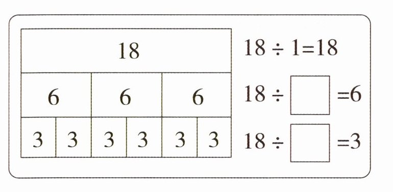 提示:从上往下观察,第一行是18,只有1个框,列式是18÷1=18;第二行是把18平均分在3个框里,每个框里的数都是6,列式是18÷3=6;第三行是把18平均分在6个框里,每个框里的数都是3,列式是18÷6=3。