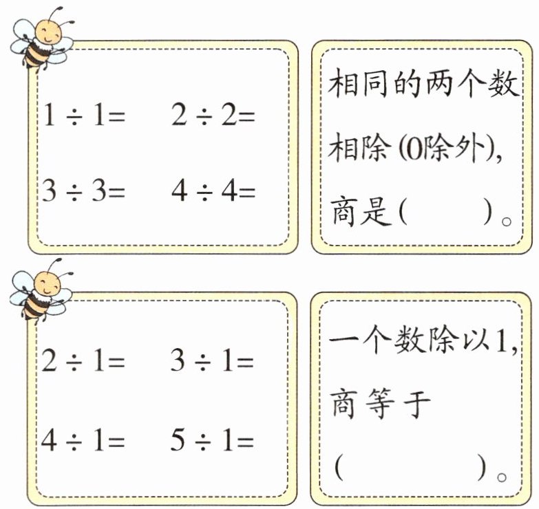 提示:除数是几,就用几的乘法口诀求商。通过计算可知,相同的两个数(0除外)相除,商是1;任何数除以1还得原数。