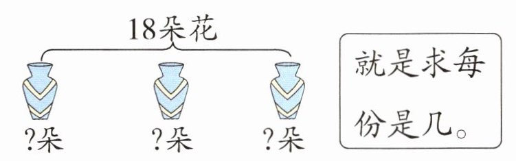 (1) 18 朵花,平均插在 3 个花瓶里,每个花瓶里插几朵?