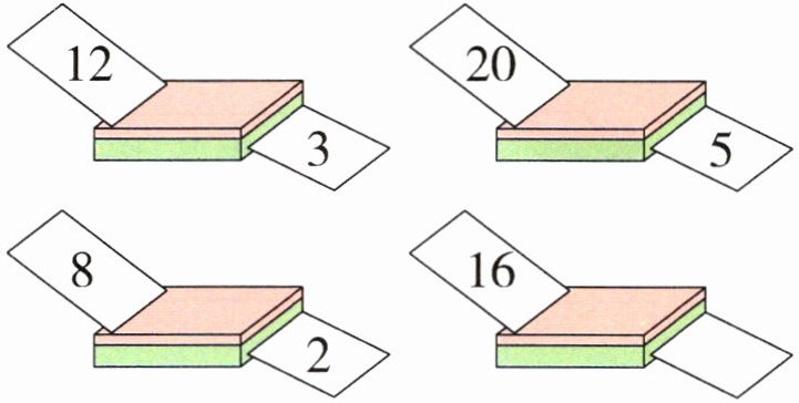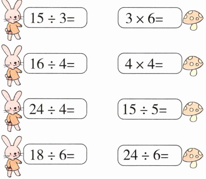 提示:先算出2×2=4,再根据“四四十六”,得到16÷4=4。先算出4+1=5,再根据“四五二十”“二五一十”得到20÷4=10÷2=5。两边除法算式的商相等即可,如5÷5=6÷6,10÷5=12÷6等。写出的除法算式的商是4即可,如8÷2=4,12÷3=4等。