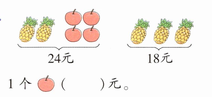 提示:3个菠萝18元,1个菠萝就是18÷3=6(元),2个菠萝是2×6=12(元),所以4个苹果是24-12=12(元),1个苹果是12÷4=3(元)。