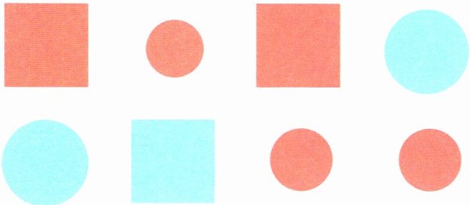 3. 先按图形的形状分一分,再按图形的颜色继续分一分。