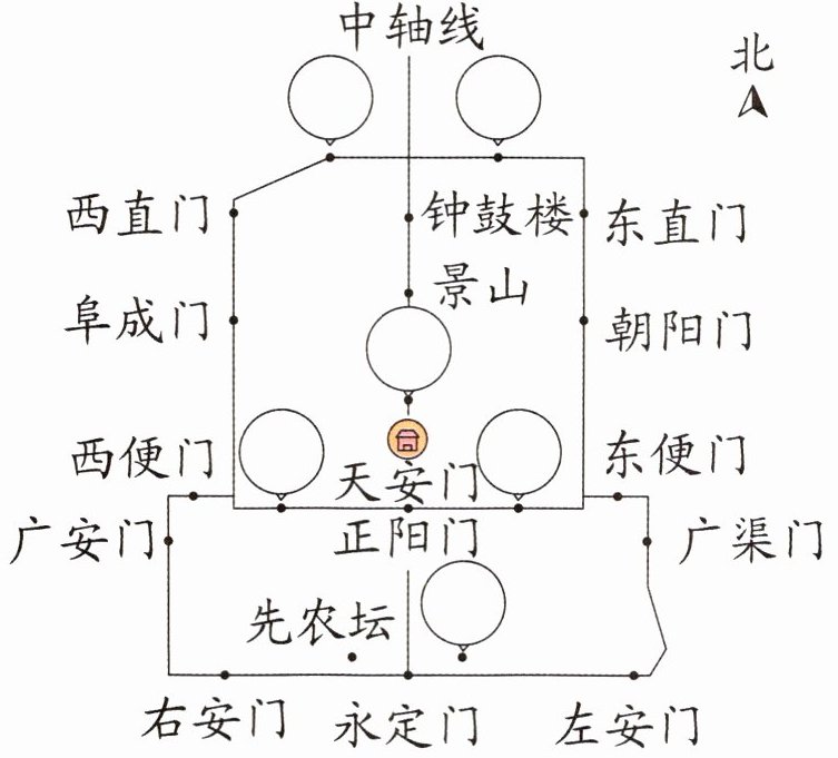 天安门的北面是故宫,天坛在先农坛的东面,正阳门的东面是崇文门。
