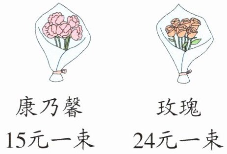 15÷5=3(元) 24÷6=4(元) 3<4 答:康乃馨更便宜。 提示:康乃馨5枝15元,那么每枝15÷5=3(元);玫瑰24元6枝,那么每枝24÷6=4(元)。因为3<4,所以只买一枝花,康乃馨更便宜。