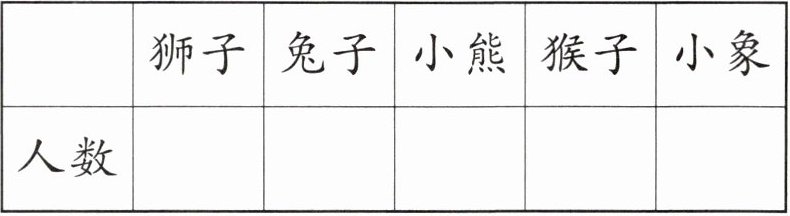 (1) 狮子 兔子 小熊 猴子 小象 人数 10 12 8 10 6 提示:根据题图中的分类结果数一数,把数出的各种动物的数量填入表格中对应的位置。