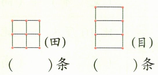 提示:"田"字中,单独的线段有12 条,2 条线段组成的线段有6 条,共12+6=18(条)。"目"字中,单独的线段有10 条,2 条线段组成的线段有4 条,3 条线段组成的线段有2 条,共10+4+2=16(条)。