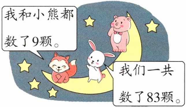 提示:根据题图信息可知,小熊、小狐狸和小兔数星星,小熊和小狐狸都数了9颗,则它们共数了9×2=18(颗),由于一共数了83颗,因此小兔数了83-18=65(颗)星星。