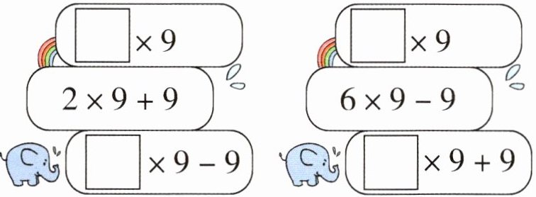 提示:9×1=10-1可以理解为1个9等于10-1;那么2个9等于2个10减2个1,即9×2=20-2;3个9等于3个10减3个1,即9×3=30-3。以此类推,9与几相乘,相当于几个10减几个1,也就是9与几相乘,积就等于几十减几。