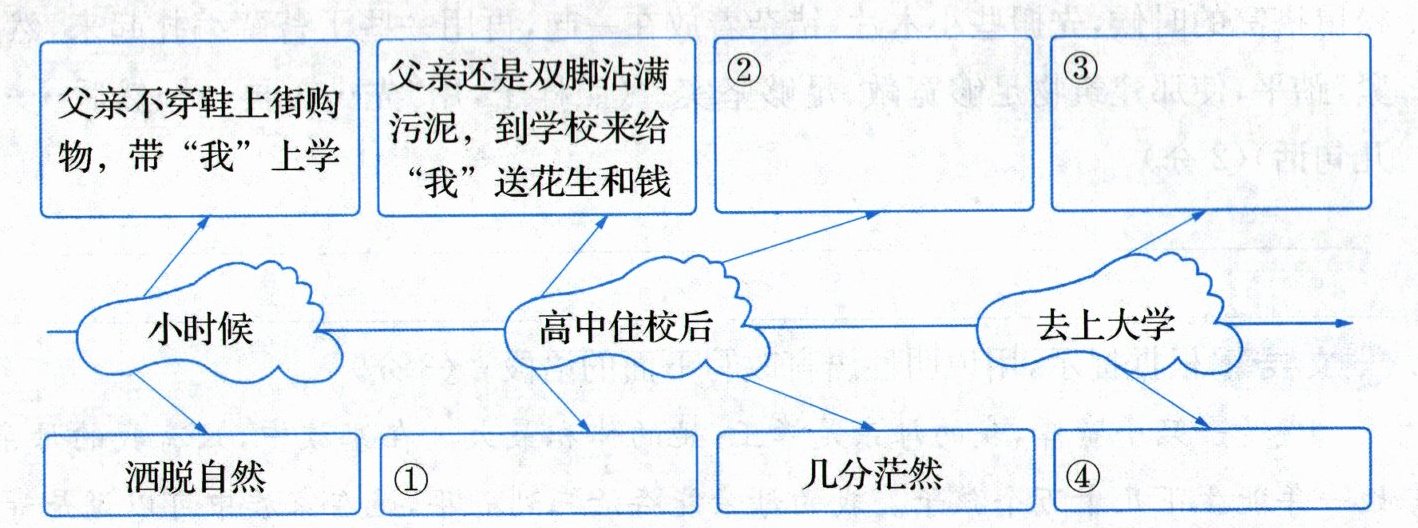 父亲还是双脚沾满污泥,到学校来给“我”送花生和钱 → 高中住校后 → ①