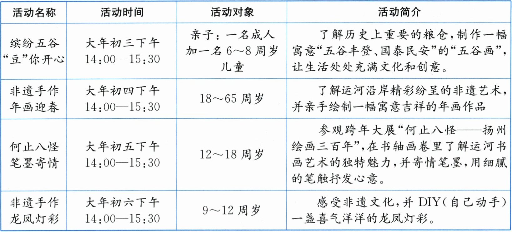 | 非遗手作 年画迎春 | 大年初四下午14:00—15:30 | 18~65周岁 | 了解运河沿岸精彩纷呈的非遗艺术,并亲手绘制一幅寓意吉祥的年画作品。 |