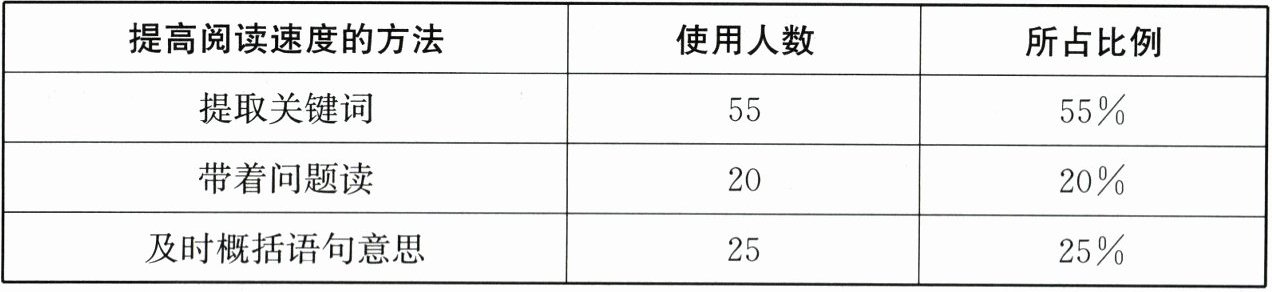 1. 示例:一半以上的同学采用提取关键词的方法来提高阅读速度;采用带着问题读和及时概括语句意思的方法来提高阅读速度的同学人数相差不多。 2. 示例:① 集中注意力,连词成句地读,不要一个字一个字地读,更不要回读。② 遇到不懂的词语,在不影响理解内容的情况下先不管它,继续往下读。