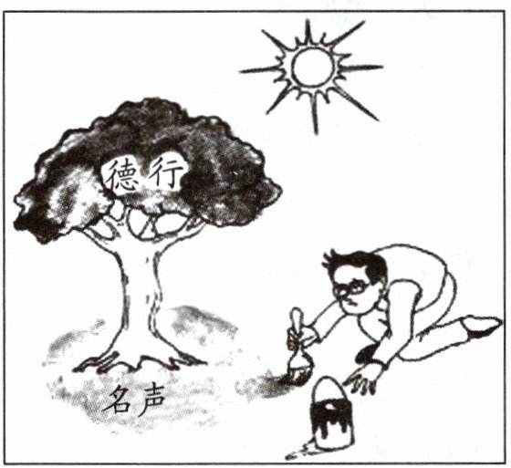 (1)内容:画面中太阳下有一棵树,树冠上写着“德行”,树影上写着“名声”,树下一个人拿着刷子刷地,努力扩大树影面积。寓意:德行如树,名声如影。德行高尚,名声才能响亮,做人若只思着扩大名声,不重视德行,是舍本逐末。(内容1分,寓言2分。意对即可)