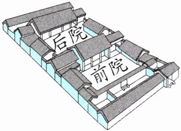 2. 新情境 人文历史 四合院是中国的一种传统合院式建筑,其格局为一个院子四面建有房屋,从四面将庭院合围在中间,因此得名四合院。图中四合院分为大小相同的前后两个正方形院子,前院的边长为$25.6m$。整个四合院的面积是多少平方米?