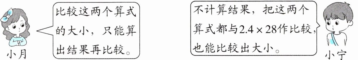 1. 新趋势 推导探究 小月和小宁在学了小数的乘法分配律之后,对比较$2.5×28和2.4×29$的大小方法产生了分歧。