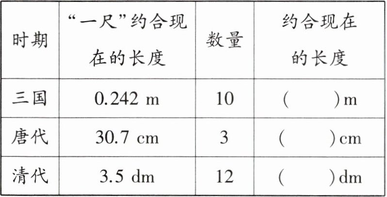 4. 新情境数学文化 你知道古代的“一尺”约合现在的长度是多长吗?请根据表中信息算一算,填一填。