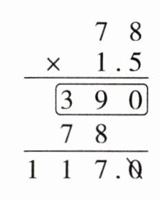 2. (名校期末真题)客车在高速公路上每小时行驶78km,1.5小时行驶多少千米?根据竖式,方框中的“390”表示(