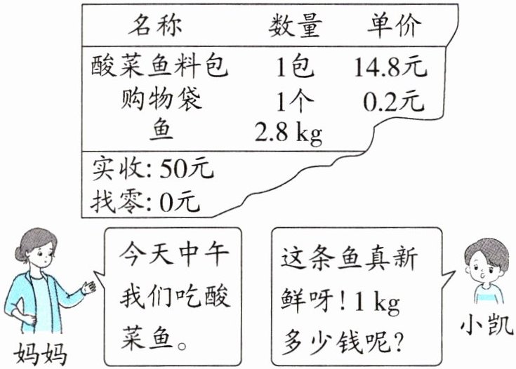 50-0.2-14.8=35(元) 35÷2.8=12.5(元) 答:这条鱼1 kg 12.5元。
