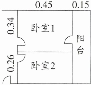 6. 新趋势 评价说明 如图是某宣传单页上的住房平面图的一部分,实际住房面积是单页上的8000倍。计算卧室2的实际面积,明明列式为$0.45×8000$,他做得对吗?如果不对,请你写出正确的解答过程。(单位:dm)