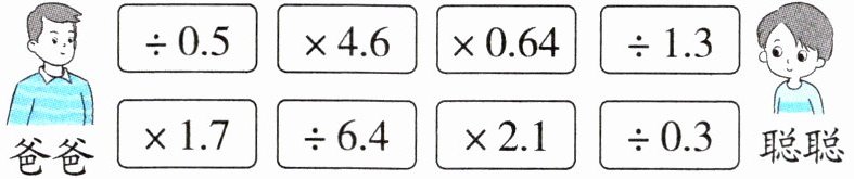 4. 新素养数感 周末,聪聪正在复习小数乘除法的知识。休息时间,聪聪爸爸和聪聪玩了一个小游戏:将下面的卡片扣在桌子上,聪聪每次从中任意拿出一张,用6.4乘或除以聪聪拿到的卡片上的数。得数大于6.4,则爸爸获胜;得数小于6.4,则聪聪获胜。