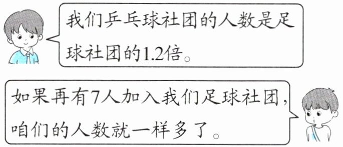提示:设足球社团有x人,因为乒乓球社团的人数是足球社团的1.2倍,所以乒乓球社团的人数是1.2x,如果再有7人加入足球社团,那么足球社团的人数就是(x+7),此时两个社团的人数一样多,可以列出方程1.2x=x+7,解得x=35,1.2×35=42(人),所以足球社团有35人,乒乓球社团有42人。