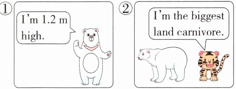 图①圈出“1.2 m”;画出:Look at this big polar bear. It's about 1.9-2.8 m high. 图②圈出“老虎”和“the biggest land carnivore”;画出:Look at this big polar bear. It's about 1.9-2.8 m high. It's the biggest land carnivore ... 图③圈出“帝企鹅”和“北极熊”;画出:Animals in the North can't meet animals in the South.