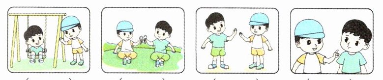 We play together. We play on the swing(荡秋千). We are so happy(开心的)!