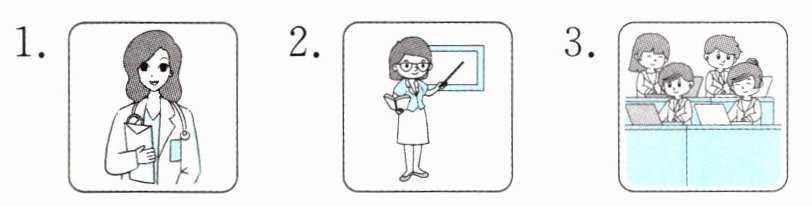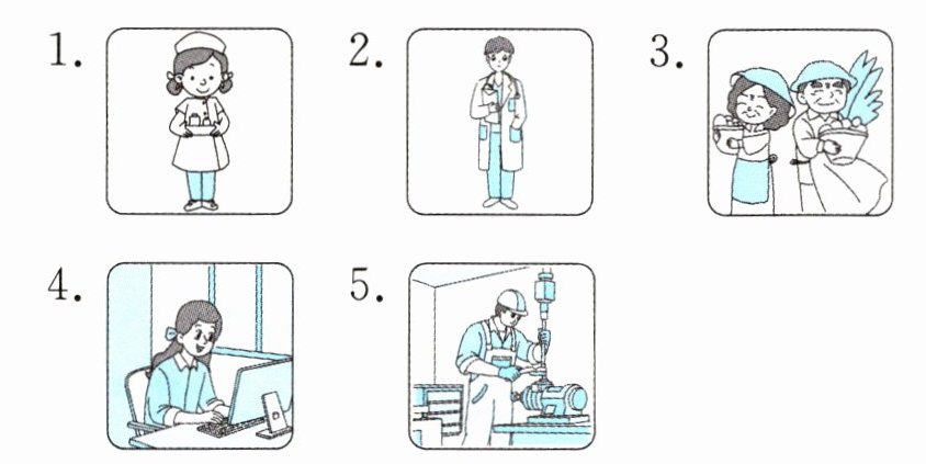1. nurse 2. doctor 3. farmers 4. office worker 5. factory worker
