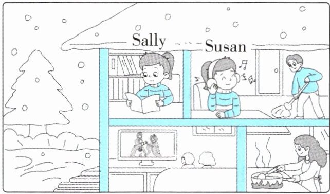 四 周六晚上,Susan 和 Sally 一家正在做什么呢?看图,完成下列任务。