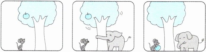 A little mouse is l______ at the apple on the tree. He's hungry and tired. But the tree is too t______,so he can't g______ it. An e______ is coming. He is shaking the tree with h______ long nose. Then,the apple falls. The little mouse is e______ it happily now.
