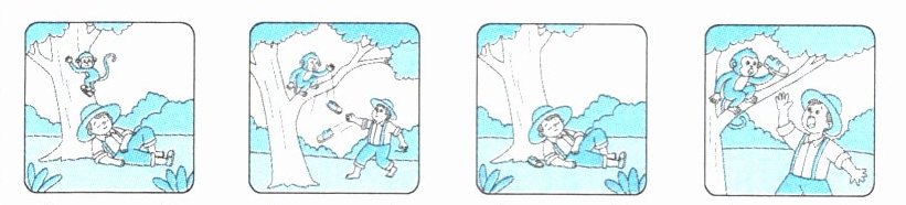 A farmer is walking in the forest. He's very tired. He says,"Let me have a nap(打个盹)here." Now he is sleeping under a big tree. One of his shoes(鞋)is beside him. A monkey picks it up and climbs up the tree. The farmer wakes up(醒来). He shouts,"Hey,Monkey! Give it back to me." The monkey shouts too. It is imitating the farmer. The farmer thinks,"The monkey likes imitating. I have a good idea." He takes off(脱掉)the other shoe and throws it away(丢掉). Guess! What does the monkey do? Yes! He throws the shoe away too. Now the farmer gets his shoes back.