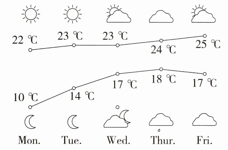 一新趋势 图表阅读 观察周一至周五的天气预报,判断句子正(T)误(F)。