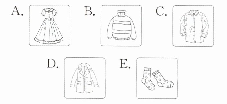 A. purple dress B. red socks C. sweater D. shirt E. coat