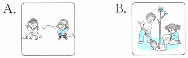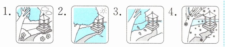 1. warm; cloudy; spring 2. hot; summer 3. cool; autumn 4. Winter; cold; snowy