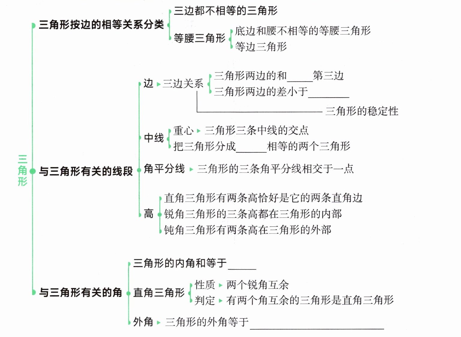 大于;第三边;面积;$180^{\circ}$;与它不相邻的两个内角之和。