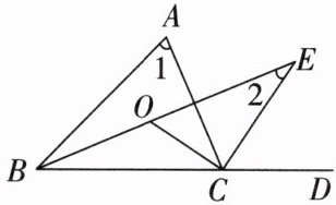 13. 如图所示,在△ABC 中,BO,CO 分别平分∠ABC,∠ACB,且相交于点 O,CE 为外角∠ACD 的平分线,BO 的延长线交 CE 于点 E. 有以下结论:①∠OCE = 90°;②∠1 = 2∠2;③∠BOC = 90° + \$\frac{1}{2}\$∠1;④∠BOC = 3∠2. 其中正确的是