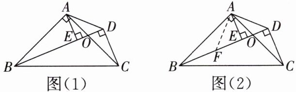 14. 【问题原型】在数学活动课上,徐老师给出如下问题:如图(1)所示,在△ABC中,∠BAC= 90°,AB= AC,以BC为斜边作直角三角形BCD,点D在边BC上方,BD与AC交于点O,连接AD,过点A作AE⊥BD于点E.求证:BE= CD+DE.(不需证明)
