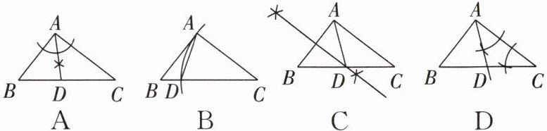 2. (2024昆明)在$\triangle ABC$中,$\angle BAC = 90^{\circ}$,$AB\lt AC$.用尺规在$BC边上找一点D$,使$AD + DC = BC$,下列作法正确的是(