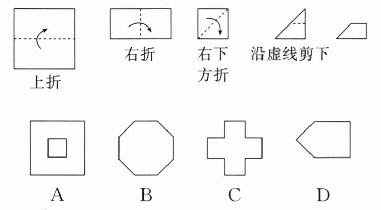1. 如图所示,把一张正方形纸片对折三次后沿虚线剪下,则所得图形是(