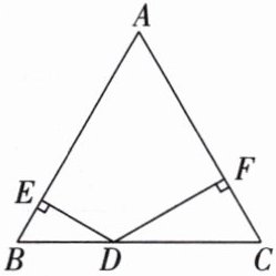 5. 如图所示,△ABC是等边三角形,点D是BC边上任意一点,DE⊥AB于点E,DF⊥AC于点F。若BC = 4,则BE + CF =