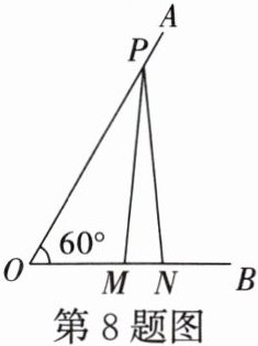 8. (2024哈尔滨期末)如图所示,已知∠AOB = 60°,点P在边OA上,OP = 12,点M,N在边OB上,PM = PN。若MN = 2,则OM的长为(