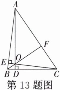 13. 如图所示,在△ABC 中,AD ⊥ BC,CE ⊥ AB,垂足分别为 D 和 E,AD 与 CE 交于点 O,连接 BO 并延长交 AC 于点 F,若 AB = 5,BC = 4,AC = 6,则 CE : AD : BF =
