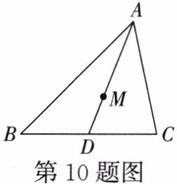 10. 如图所示,在△ABC 中,AD 交边 BC 于点 D. 设△ABC 的重心为点 M,若点 M 在线段 AD 上,则下列结论正确的是(