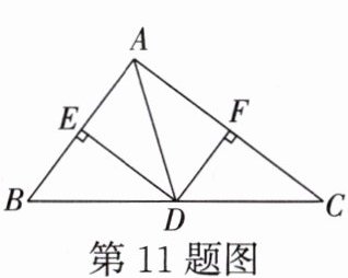 11. 如图所示,在△ABC 中,AD 为中线,DE ⊥ AB 于点 E,DF ⊥ AC 于点 F,AB = 3,AC = 4,DF = 1.5,则 DE =