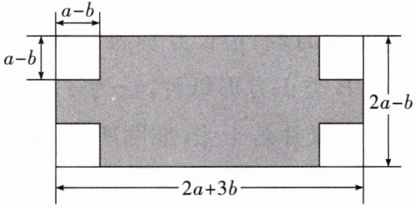 6. 如图所示,某市有一块长为$(2a + 3b)$m,宽为$(2a - b)$m的长方形土地,角上有四个边长均为$(a - b)$m的小正方形空地,政府计划将阴影部分进行绿化。用含$a$,$b$的代数式表示绿化的面积(结果写成最简形式)。