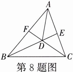 8. 如图所示,$BE$,$CF是\triangle ABC$的角平分线,$BE$,$CF相交于点D$,$\angle ABC = 50^{\circ}$,$\angle ACB = 70^{\circ}$,则$\angle ADE$的度数是