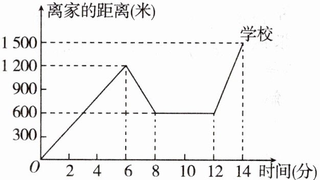(4) 小明往常的速度为 $ 1200 ÷ 6 = 200 $(米/分),去学校需要花费的时间为 $ 1500 ÷ 200 = 7.5 $(分),本次上学共用了 14 分钟,比往常多用的时间为 $ 14 - 7.5 = 6.5 $(分)
