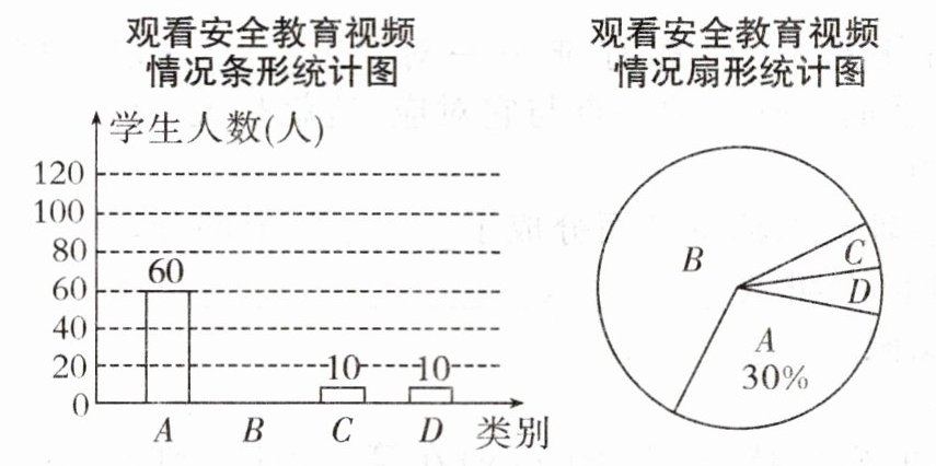 (2) B 类有$200-60-10-10=120$(人). 补全条形统计图如图.观看安全教育视频情况条形统计图