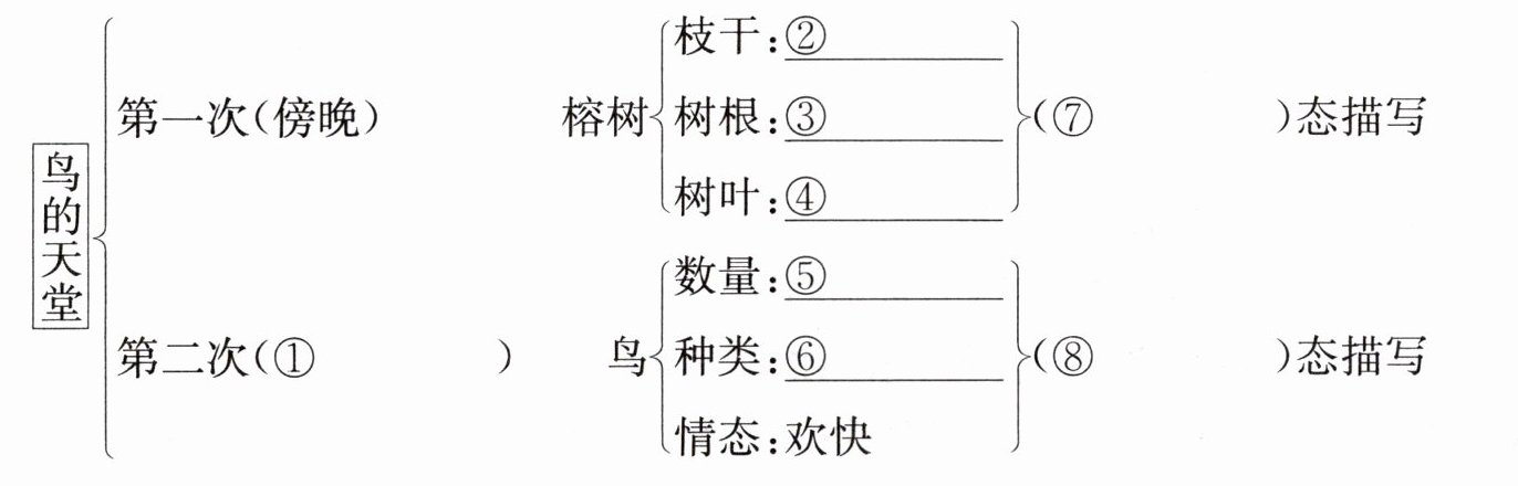 作者第一次见到的大榕树有什么特点?第二次见到的榕树上的鸟儿又是怎样的?分别运用了什么描写手法?填一填。
