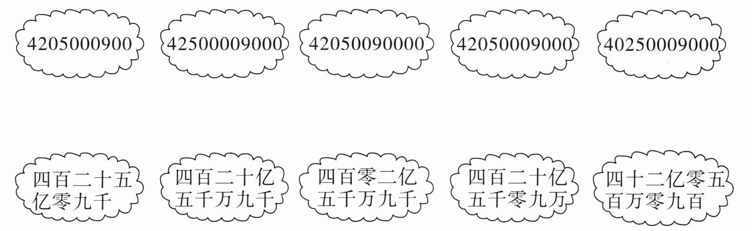4205000900—四十二亿零五百万零九百;42500009000—四百二十五亿零九千;42050090000—四百二十亿五千零九万;42050009000—四百二十亿五千万九千;40250009000—四百零二亿五千万九千