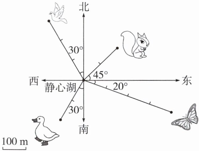2.小松鼠在静心湖东偏北45°方向上,距离静心湖200m;蝴蝶在静心湖东偏南20°方向上,距离静心湖400m;小鸭在静心湖南偏西30°方向上,距离静心湖200m